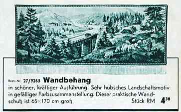 | | Grossversandhaus Trifels, Lambrecht/Saarpfalz, Katalog | | "Wandbehang", nicht etwa mit einem röhrenden Hirschen am Waldsee, sondern mit "hübschem Landschaftsmotiv" samt Autobahnbrücke.