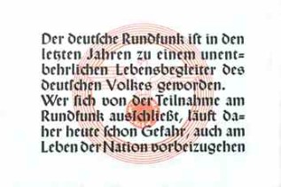 | |  | | "Der deutsche Rundfunk ist in den letzten Jahren zu einem unentbehrlichen Lebensbegleiter des deutschen Volkes geworden. Wer sich von der Teilnahme am Rundfunk ausschließt, läuft daher schon heute Gefahr, auch am Leben der Nation vorbeizugehen." | | "Jetzt kannst auch Du Rundfunkteilnehmer werden!"