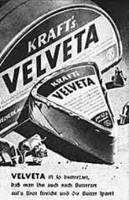 | | "VELVETA ist so butterzart, daß man ihn auch nach Butterart auf's Brot streicht und so Butter spart."