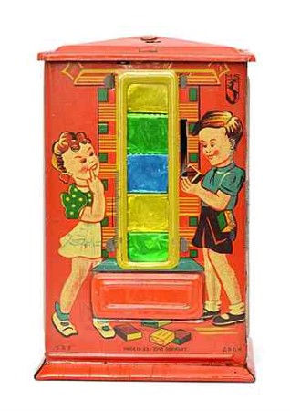 | "Warenautomat" von Michael Seidel: Nach Einwurf einer Münze gibt die Spardose ein Stück Schokolade frei... - mehr Spardosen HIER