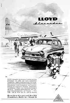 da er eine durch ein Hartholzgerippe zusammengehaltene Sperrholz-Karosserie besaß, die abschließend mit Kunstleder überzogen wurde. Weil nicht viel Fantasie dazugehört, sich auszumalen, dass eine solche Konstruktion ihren Insassen bei einem Unfall sicherlich nicht die besten Überlebenschancen bietet, musste sich der Zweitakter zudem den Spottreim „Wer den Tod nicht scheut, fährt Lloyd“ gefallenlassen. Nichtsdestotrotz entwickelte sich der LP 300, der ursprünglich „Star“ heißen sollte, zum Verkaufsschlager im unterhalb des VW-Käfers angesiedelten Preissegment. Dies ist einerseits darauf zurückzuführen, dass der damalige Käufer als Gegenwert für den Preis von 3324 DM ein zwar kleines, dennoch aber zuverlässiges und vollwertiges Auto mit Platz für die vierköpfige Durchschnittsfamilie erhielt, lag sicherlich aber auch daran , dass sich Borgward nicht auf seinen Lorbeeren ausruht, sondern unermüdliche Modellpflege betreibt. So werden 1951 Kombi- und Coupe-Versionen angeboten und rechtzeitig zur IAA im Jahre 1953 präsentiert Lloyd das stärker motorisierte Nachfolgemodell LP 400 mit einer Stahlblechkarosserie, bei der nur noch das Dach aus Kunststoff besteht. Auch die Zeitschriftenwerbung hält mit diesen Verbesserungen Schritt und kommt in einem zunehmend moderneren Gewand daher. Beschränkt sie sich anfangs noch auf die bloße Hervorhebung technischer Eigenschaften („Stahlponton, hydraulische Bremse, Vollgasfest“), werden die Werbebotschaften später in Anzeigen verpackt, die den redaktionellen Beiträgen der jeweiligen Zeitungen zum Verwechseln ähnlich sehen und sich beispielsweise in Frauenzeitschriften gezielt an die weibliche Leserschaft wenden. „Sicher, ich verstehe als Hausfrau nicht viel von technischen Dingen“, heißt es in einem entsprechenden Inserat in Constanze, „aber unser Häuschen im Grünen hat erst seinen richtigen Wert gewonnen, seit unser Vati den Lloyd gekauft hat. Über eine Stunde unseres Familienlebens schenkt uns der Wagen täglich mehr, ausgeruht und guter Laune kommt Vati abends heim, kein noch so schlechtes Wetter hält ihn auf.“ Im weiteren Verlauf des Textes wird das komplette zeitgenössische Kaufargumentationsspektrum abgehandelt: „Ehrensache, dass ich natürlich auch den Führerschein gemacht habe, schon wegen der bisher so schwierigen Besorgungen in der Stadt.“ Und zu guter Letzt ist bei den geringen Betriebskosten sogar „im kommenden Jahr die lange geplante Italienreise sicher.“ Selbst im Ausland ist der Lloyd begehrt, aber nicht nur bei Borgward, sondern auch bei den meisten anderen Herstellern „brummt“ mittlerweile das Exportgeschäft.