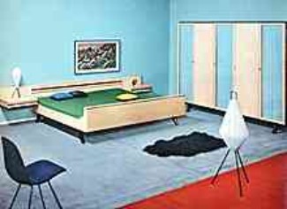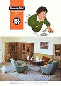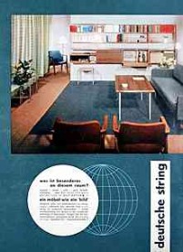 | |  | "Moderne Raumgestaltung verlangt Möbel mit klarer, reiner Form, die auch nach Jahren noch gültig ist und guten Geschmack verrät. In den Maßen müssen die Möbel abgestimmt sein auf die kleineren und niedrigeren Wohnungen von heute. Und bei der Unterteilung haben die Wünsche der Hausfrau besonderes Gewicht."