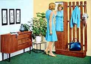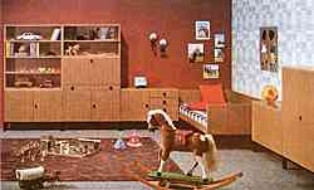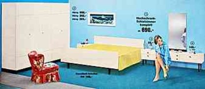 | |  | | "Wohnzimmerschrank 985.-, echt Nußbaum furniert. Für Ihr Fernsehgerät ist Platz vorgesehen." | | "Auch immer mehr ältere Menschen und gerade die, die im Herzen jung geblieben sind, wollen auf die gemütliche Atmosphäre einer zeitgemäßen Einrichtung nicht mehr verzichten."