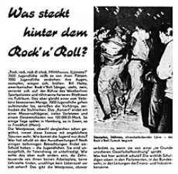"Was steckt hinter dem Rock' n' Roll? "Rack, rack, rack di clack, Hhhhhuuuu, Jjjjaaaa!" 7000 Jugendliche reißt es von ihren Plätzen. 7000 Jugendliche verdrehen ihre Augen, stampfen, wiegen sich, brüllen. Bill Haley, amerikanischer Rock' n' Roll-Sänger, steht, nein, verrenkt sich auf der Bühne des Westberliner Sportpalastes und röhrt seine heiseren Rhythmen ins Publikum. Das aber gleicht einer vom Veitstanz besessenen Menge. (...) Das "Konzert" endet mit einer Massenschlägerei, vielen Verletzten und einem Gesamtschaden von 120000 D-Mark. (...) Wie kommt die Jugend nur dazu?" (...) Die Jugendlichen "sind unausgefüllt, ihr Tatendrang ist unbefriedigt. Wie sollte das aber auch anders sein, da Zehntausende von ihnen keinen Arbeitsplatz, keine Lehrstelle finden, unzählige kein Lebensziel vor sich sehen?" - Zeitschriftenartikel