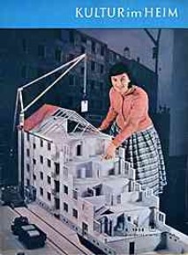 | | "KULTUR im HEIM", Zeitschrift - "Unser Titelbild: Man könnte direkt neidisch werden, nicht wahr? - Aber lassen Sie nur, jeder Werktätige unserer Republik wird es sich bald so gemütlich inmitten einer modernen Wohnungseinrichtung machen können." | | VEB Deutsche Werkstätten Hellerau - "Aus wertvollen Hölzern edel in der Form gediegen in der Verarbeitung", Zeitschriftenwerbung | | "KULTUR im HEIM", Zeitschrift - Themen z.B.: "Wie Wär's mit einem Pflanzenfenster?", "Jedem seine Villa?, "Dachwohnungen - ein Provisorium?", "Wohin mit dem Klavier?", "Eine erfahrene Hausfrau weiß sich zu helfen", "ABC für Amateur-Architekten"