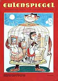 | | EULENSPIEGEL - Titel: "Schließlich sorgt man sich ja als fortschrittlicher Mensch darum, daß die eigene Frau den allgemeinen Fortschritt bei der Gleichberechtigung keinen Augenblick aus den Augen verliert." | | EULENSPIEGEL - Titel: "Nach Tonnen haben wir unseren Betriebsplan jedenfalls erfüllt."