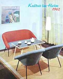 | | | | Hans Lewitzky - "meine wohnung", zweite Auflage 1962 - Themen z.B.: "Wohnungsbau heute - Typenwohnungen", "Aufgabe des Möbels im Raum und die Möbelarten", "Farbe im Raum" | | Kalender "Kultur im Heim 1962" - Sitzmöbel: "Entwurfsbüro der volkseigenen Möbelindustrie Waldheim/Sa.", Anbauschränke: "Entwurfsbüro Schkeiditz, Typensatz 198, Material: Afromosia" | | |