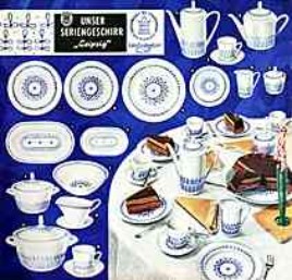 Versandhaus Leipzig - "Plasterzeugnisse - ein Ausdruck unserer Zeit"         Kahla Könitz - Tafelservice/Kaffeeservice - "Weißes Porzellan mit Rosendekor in naturgetreuer Farbwiedergabe, zeitlos in Form und Dekor."