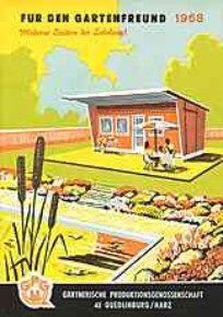 | Gärtnerische Produktionsgenossenschaft Quedlinburg: "Für den Gartenfreund" - "Moderne Stätten der Erholung", Prospekt für Gartenpflanzen mit schöner Abbildung einer Datsche (Datscha)