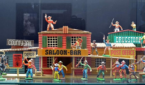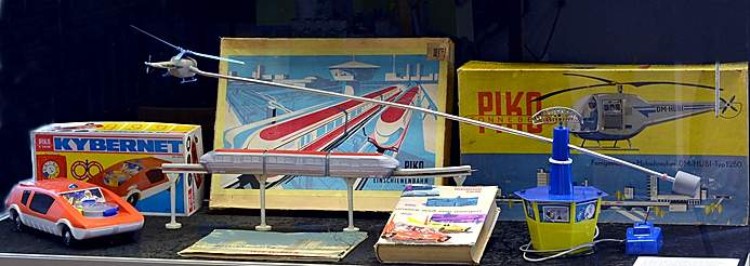 | Plakat-/Flyerfoto |  | Weltraumspielzeug 1957 elektrisierte der Satellit Sputnik, der erste "künstliche Erdtrabant", die gesamte Welt und sorgte durch den offensichtlichen russischen Technologievorsprung in der westlichen Welt für einen regelrechten Schock. Als ein Beispiel von vielen ließ es sich das DDR-Spiel "Mit den Sputniks rund um den Erdball" aus dem Jahr 1958 natürlich nicht nehmen, diesen Vorsprung - und damit natürlich auch automatisch die vermeintliche Überlegenheit des gesamten politischen Systems - zu preisen: "Überall waren die Menschen den Sputniks auf der Spur; die großen Himmelsfernrohre verfolgten sie auf ihren Bahnen um den Erdball. In der Morgen- und Abenddämmerung sahen die Menschen in Leningrad und Berlin, in Paris und Kapstadt und überall auf unserer Erde mit bloßen Augen die Sputniks." |  | | |  | | |  | Die Welt von morgen In Planungen für zukünftige Verkehrskonzepte wurde der Einschienenbahn Ende der 1950er Jahre ein hoher Stellenwert beigemessen, es existierten bereits konkrete Pläne für eine Strecke in Jena. Vor allem aus wirtschaftlichen Erwägungen blieb es jedoch beim Wunschdenken. Als Spielzeug wurde die Einschienenbahn zumindest im Miniaturformat zur Realität und auch eine hochaktuelle Zukunftsversion heutiger Tage, das programmierbare selbst fahrende Auto, war bereits in den 1970er Jahren in den DDR-Kinderzimmern zu finden. |  | Abenteuer Von jeher begeistern sich Kinder an abenteuerlichen Geschichten. Sie beflügeln die Fantasie und regen zum Spiel an, das in seiner Vielfalt stets neu ist und nie langweilig wird. – Das Angebot in der DDR produzierter Ritter, Cowboy- und Indianerfiguren samt Zubehör war so groß, dass dieser Spielzeugbereich mittlerweile zu einem eigenständigen Sammelgebiet geworden ist. |  | | |