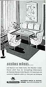 | |  | | | | "Besser leben schöner wohnen" - "Möbel-Wanderausstellung des Ministeriums für Leichtindustrie und der deutschen Bauakademie", Heft - Mehr zum Thema "DDR-Möbel 50er Jahre" HIER | | Deutscher Innen- und Aussenhandel - "Schöne Möbel sind Ausdruck einer hohen Kultur", Zeitschriftenwerbung | |
