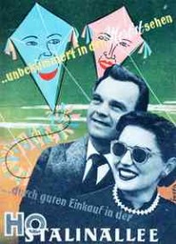 | |  | |  | | "Faschingsfreuden durch Einkauf in den Spezialverkaufsstellen der HO-Stalinallee" | | "...und nach dem Einkaufen bei der HO Stalinallee volle Fahrt in den Urlaub" | | "..unbekümmert in den Herbst sehen durch guten Einkauf in der HO Stalinallee"