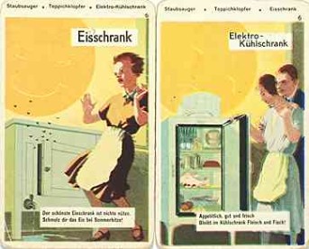 | | "Man sieht es an der Stromrechnung...Bosch-Kühlschränke arbeiten sparsam! Eine Freude für Jahrzehnte ist so ein Bosch-Kühlschrank mit verringertem Stromverbrauch, mit gleichbleibender Kälte, Eiswürfelbereitung und praktischer Abstellfläche auf dem Deckel." - Werbeblatt (1936) |