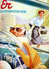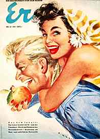So modern und aufgeschlossen sich „Er“ über weite Strecken präsentiert mag: wenn es um die Stellung der Frau geht, die nach Umstände bedingter Selbstständigkeit in den Kriegs- und Nachkriegsjahren nun wieder an den Herd zurückgeholt werden soll, zeigt man sich, zumindest zu Beginn der 50er, noch überwiegend konservativ. Im Artikel „Welche Frauen werden begehrt? Ein aktuelles Problem“ erfährt frau in einer für heutiges Empfinden sicherlich unfreiwillig komisch klingenden Wortwahl, was von ihr erwartet wird: „Eine kluge Ehefrau wird ihren Mann immer nett empfangen, ihn nicht gleich beim Heimkommen mit häuslichem Ärger überfallen, sondern vielmehr versuchen, durch ein nettes Kleid und freundliches Lachen frohen Willkommensgruß zu bieten.“ Steigerung gefällig? „Wohl alle Männer sind sich darin einig: Eine Frau darf nicht eifersüchtig sein. Es schadet dagegen nichts, wenn Sie hin und wieder um die Treue des Ehegatten bangt.“ Und als Höhepunkt: „Frauen müssen sich gut kleiden, ohne Extravaganzen zu lieben. Wir lieben ihre Natürlichkeit. Sie sollen nicht unbedingt klug sein, aber das Herz am rechten Fleck haben.“ Nochmals bekräftigt wird diese männliche Sichtweise der Verhältnisse in der Abteilung „Herrenwitz“, die von Beginn an auf einer und später sogar zwei eigenen Seiten fester Bestandteil des Hefts ist. „Man weiß, dass er es in sich hat.“ Dennoch „ist der Herrenwitz niemals zotig. Er hasst aufdringlichen Lärm, krakeelendes Lachen und wiehernde Begeisterung und man kann ihn getrost „gerade noch“ in jeder Damengesellschaft erzählen, sofern man nicht grundsätzlich derartige Dinge als groben Verstoß gegen die gesellschaftlichen Sitten verwirft.“ Endlich erfährt der Leser auch, was denn nun den Mann zum Herrn macht: „Die innerliche und äußerliche Haltung, das Bestreben, Manieren zu zeigen und die einwandfreie charakterliche Einstellung zu den Dingen des Lebens.“ Ein gepflegtes Äußeres allein ist kein untrügliches Merkmal. „Wichtiger als eine elegante Garderobe scheint Lebensart und Korrektheit namentlich im Umgang mit Frauen. Daran – und nur daran erkennt man der wirklichen Herrn.“