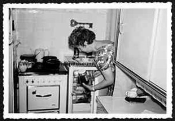 | | "Manfred 24.4.1957" | | Kind bietet dem großen Bruder "Sandkuchen" an