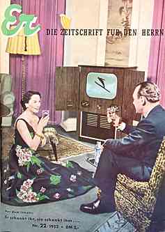 | | "Vor dem Bildschirm glücklich vereint. Fernsehen bringt eine neue Zeit der Geselligkeit. KaDeWe sorgt durch günstige Angebote und Direkt-Kredit dafür, daß Sie dem Zeitgeschehen nicht abseits stehen.", KaDeWe-Prospekt (wohl 1958) |  | |  | | "Das dürfen Sie nicht versäumen...", Heft zur Funkausstellung 1957 in Frankfurt am Main | | "Beim Fernsehen - Auge und Ohr werden von diesem technischen Wunder oft über Gebühr in Anspruch genommen. Zum Ausgleich sollte man ein belebendes und anregendes Getränk zur Hand haben, einen sehr guten Weinbrand, einen Scharlachberg Meisterbrand." (1957) |  | |  | |  | "Grundig Fernsehgeräte" - "Das Fernsehen - der Wunschtraum unserer Generation - ist in diesen Tagen prachtvolle Wirklichkeit geworden.", Prospekt (1953)