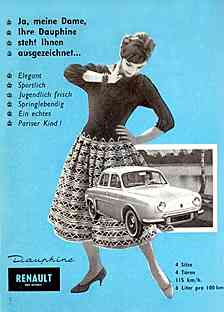 | | Emanzipation oder geschickte Bedarfsweckung der Hersteller? Zwei Jahre später besitzt "die Dame" offensichtlich ein eigenes Auto und damit auch ihren eigenen Knirps-Taschenschirm - "Für das Auto der Dame" (1959) | | "Morgen so begehrt wie heute - Die Welt sagt ja zu Renault" - 600 km ist sie gefahren, um ihn zu besuchen. Wenn der Tachometer 60000 zeigt, wird ihre Dauphine noch genauso chic, genauso modern sein wie heute." (1960)