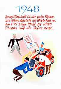 | |  | | | "1948 - George Marshall ist der rechte / Mann sein Plan kurbelt die Wirtschaft an / das ERP zum Wohl der Welt / Europa auf die Beine stellt." - Aus einer ERP-Dokumentation von 1950