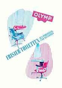 | | Stuttgart "beheimatet auch die OLYMP-Friseur-Einrichtungen. Hier werden die Ideen geplant und verwirklicht, die jedem modern und wirtschaftlich denkenden Friseur vorschweben: einen Salon zu besitzen, der organisatorisch bis ins kleinste Detail durchdacht und mit sicherem Geschmack bis in den letzten Winkel durchgestaltet ist", Werbeblatt