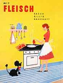 | "Fleisch - Das Volksnahrungsmittel" | | "Mit Fleisch - rasch billig nahrhaft" | | "Der Sonntagsbraten" - "Liebe Kundin! Beginnen Sie auch im Sommer den Tag mit einem ordentlichen Frühstück, mit Schinkenspeck und Wurst. Dann haben Sie eine solide Grundlage für den ganzen Vormittag." |