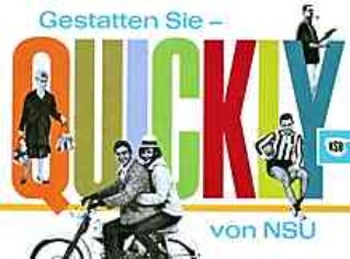 "Gestatten Sie - QUICKLY von NSU" "Sie wollen vorankommen - Sie wollen etwas erreichen - einen höheren Posten, ein eigenes Haus oder zumindest pünktlich den Arbeitsplatz. Und das ist gut und richtig und aller Unterstützung wert. Zwar, mit einem höheren Posten und einem Eigenheim können wir Ihnen zunächst nicht dienen. Aber was die Pünktlichkeit angeht, so wüßten wir Rat. Oder vielmehr "Rad": eine Quickly von NSU." - "Vollkarossiert wie ein Roller - und sparsam wie ein Moped, so stellt sich Ihnen die Quickly-T vor, die Traum-Quickly von NSU." - Prospekt
