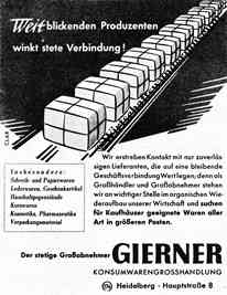 "Wir erstreben Kontakt mit nur zuverlässigen Lieferanten, die auf eine bleibende Geschäftsverbindung Wert legen; denn als Großhändler und Großabnehmer stehen wir an wichtiger Stelle im organischen Wiederaufbau unserer Wirtschaft und suchen für Kaufhäuser geeignete Waren aller Art in größeren Posten. – Der stetige Großabnehmer GIERNER Konsumwarengrosshandlung Heidelberg" – Inserat (Januar 1947)