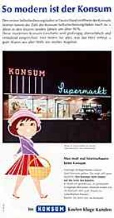 "So modern ist der Konsum" "Den ersten Selbstbedienungsladen in Deutschland eröffnete der Konsum. Seither nimmt die Zahl der Konsum-Selbstbedienungsläden rasch zu - allein in den letzten beiden Jahren um über 90%. Diese modernen Konsum-Geschäfte sind großzügig, übersichtlich und einladend eingerichtet. Hier finden Sie alles, was das Herz erfreut - gute Waren aus aller Welt, ein reiches Angebot." - "Im KONSUM kaufen kluge Kunden"
