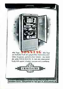 | | "Alle Tage SONNTAG Alle Tage ein festlicher Tisch mit gutgekühlten Getränken, köstlichen Eisspeisen, gartenfrischen Salaten: das bietet der echte FRIGIDAIRE. Er hält alle Lebensmittel frisch, hilft sparen, ist selbst sparsam und zuverlässig." (1949)