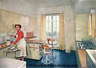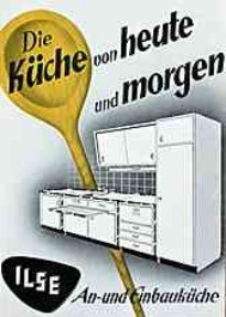 | | "Raus mit dem Schnörkelbüfett! - "Ändert eure Küchen und ihr ändert euer Leben" - dieses amerikanische Schlagwort ist jetzt auch ein deutsches geworden. Es steht auf Punkt 1 auf dem Umerziehungsprogramm, mit dem moderne westzonale Wohnspezialisten die deutsche Hausfrau von einigen lieben alten Küchengewohnheiten abbringen wollen." Zeitschriftenbericht (1952) |