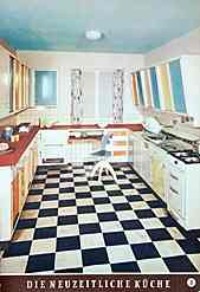 | | | | "In der Siematic-Küche kochen Sie mit Vergnügen, denn die vielen technischen Neuerungen erleichtern Ihre Arbeit und werden Sie begeistern: durchlaufende Griffleisten, selbstschließende Matic-Türen ohne Schloß und Schnäpper, Verstellmechanik zur individuellen Innenausstattung, Elektroleiste für Stromversorgung an jedem Arbeitsplatz." (1960) | | Kopp Kunststoff-Küchen "für Frauen mit Köppchen"- "Die Oberfläche besteht aus feinstem Kunststoff oder einem Perlmutterlack von bisher nicht gekannter Schönheit." (1960) |
