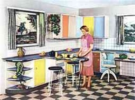 | | |  | | | | | | "Moderne Küche mit allen Schikanen - Die Küche, die Sie hier sehen, ist richtig organisiert. Das heißt: die einzelnen Arbeitsplätze liegen in der richtigen Reihenfolge." - Aus einer Zeitschrift (1955)