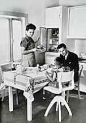 | | "Frohe Farben - frohe Arbeit" - "Die ganze Familie freut sich. (...) Die appetitlich saubere Tischplatte aus Kunststoff ersetzt das althergebrachte hölzerne Knetbrett. Und dann die Kunststoffplatten auch auf Arbeitsflächen und Fußboden, mit denen Farbe wirksam in den Raum eingezogen ist und gute Laune verbreitet." (1958) |