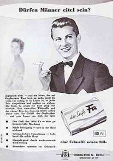 "Erfolgreiche Männer erregen immer das Interesse der Umwelt. Sie legen mit Recht viel Wert auf das gute Aussehen - auf eine gepflegte Haut." - Werbung für "die Seife Fa" - "eine Feinseife neuen Stils" (1956)