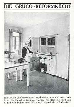 | | "Die Gruco "Reform-Küche" brachte der Frau die neue Freiheit. Die Hausfrau ist immer fertig. Sie plagt sich nicht den 5.Teil wie früher und erhält sich jugendlich und elastisch."