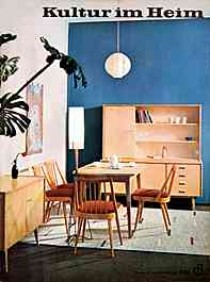 | | | | Kalender "Kultur im Heim 1962" | | Kalender "Kultur im Heim 1962" - Sitzmöbel: "Entwurfsbüro der volkseigenen Möbelindustrie Waldheim/Sa.", Anbauschränke: "Entwurfsbüro Schkeiditz, Typensatz 198, Material: Afromosia" | | |