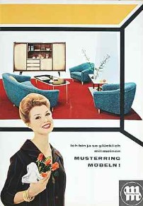 |  | Musterring - "Die Liebe, mit der wir unsere Wohnung ausstatten und gestalten, ihr unsere eigene, persönliche Note geben - diese Liebe kehrt täglich und tausendfach zu uns zurück als Freude und Glück am schönen und gepflegten Heim, in dem wir uns erholen und entspannen, in dem wir frohe und heitere Stunden erleben, sei's allein, im Kreis unserer Familie oder in der Runde mit Freunden." (1955)