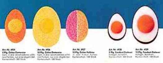| |  | Candy-Container-Osterei | | Candy-Container-Osterei |  | |  | |  | "6,- DM Präsent-Ei - vier verschieden glattstanniolierte Eier mit Schleife. gefüllt mit feinen Pralinen." | | "3,- DM Geschenk-Ei-Sortiment - vier verschieden stanniolierte Eier mit Schleife. gefüllt mit feinen Pralinen."