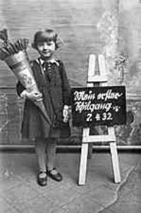 | | "Unsere neue Fibel" (1967) |  | | Auf dem Weg zur Schule - Privatfoto Sammlung Wirtschaftswundermuseum (um 1964) |  | |  | Äpfel, Apfelsinen, Schuhe, Sarotti-Schokolade: Geschenke zur Einschulung vor über 100 Jahren (Privatfoto, schätzungsweise um 1910)