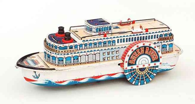 | Typische japanische Blechspielzeuge der späten 60er / frühen 70er Jahre, die fahren, blinken, scheppern, pfeifen und einen Höllenlärm verursachen. Leider war der Gestalter des obigen Raddampfers namens "Queen River" offensichtlich des Englischen nicht ganz mächtig. Statt Königin-Fluß hätte er wohl eher Flusskönigin heißen sollen...