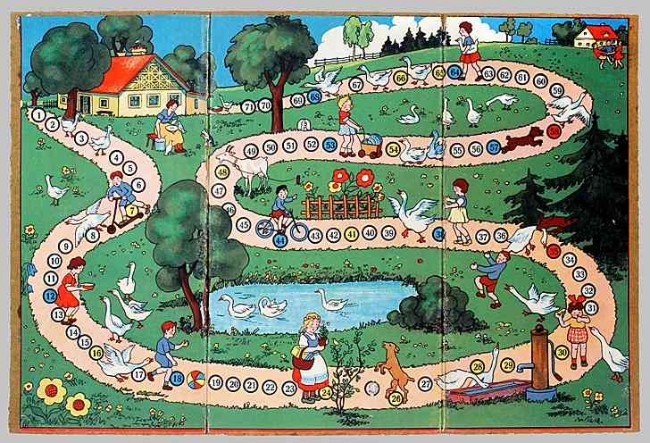 |  | "Gänseliesl" - Der Typ des Gänsespiels, bei dem die Spieler entsprechend der Zahl der jeweils gewürfelten Augen wie im Gänsemarsch in einer Reihe hintereinander her laufen, gehört zu den ältesten und am weitest verbreiteten Brettspielformen. Nach vergleichbarem Prinzip konzipierte Vorläufer lassen sich bis in die Zeit der "alten Ägypter" zurückverfolgen. - Im Gegensatz zum kindgerecht heiter illustrierten Exemplar weiter oben vermitteln die Zeichnungen bei dem hier zeigen auf besonders martialische Weise, was so einer armen Gans denn alles Schlimmes widerfahren kann. Da passt es wie die Faust auf's Auge, dass der Bemaler der Zinnfiguren offenbar mit der roten Farbe schluderte und eine der Spielgänse wie bluttriefend daher kommt. - Ein wenig makaber, aber trotzdem irgendwie schaurig schön, das Ganze...