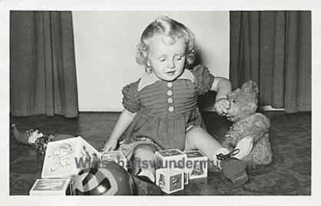 | |  | | "Helga" | | "Jennifer" | "Wertvoll" sind für mich nicht Puppen, die ein bestimmtes Markenemblem auf dem Rücken haben, sondern vor allem solche, zu denen noch Erinnerungen des ursprünglich damit spielenden Kindes zu erfahren sind. So bedanke ich mich ganz herzlich bei Brigitte für diese beiden hübschen Spielzeuge und folgenden Text: "Die Puppe rechts habe ich von meinem Opa bekommen. Der hat sie von seinem Stiefsohn, der in Amerika lebt, für mich mitgebracht. Ich habe sie Jennifer getauft. Die linke Puppe habe ich von meinem Vater bekommen, als wir mit bei den ersten Touristen nach Österreich fuhren u. von dort einen Ausflug nach Meran unternommen haben. Sie wurde auf dem Markt in Meran erstanden. Ich habe sie Helga getauft. Beide Puppen stammen aus den Jahren ca. 1957/58."
