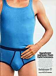 "Im Zeitalter der Synthetiks sitzt Schiesser aus Baumwolle der Haut am nächsten. Diese Schiesser 20-Kombination aus Norweger-Knüpf (Hemd: Modell "Oslo", Slip: Modell "Peer") ist für Ihren Körper wie eine Klimaanlage." (1963)