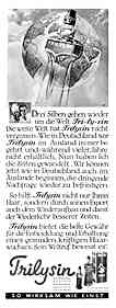 "Die weite Welt hat Trilysin nicht vergessen. Wie in Deutschland war Trilysin im Ausland immer begehrt und - während vieler Jahre nicht erhältlich. Nun haben sich die Zeiten gewandelt. Wir können jetzt in Deutschland wie auch im Auslande beginnen, die dringende Nachfrage zu befriedigen. So hilft Trilysin nicht nur Ihrem Haar, sondern durch seinem Export auch dem Wiederaufbau und damit der Wiederkehr besserer Zeiten." - "Trilysin - so wirksam wie einst"
