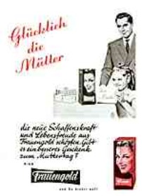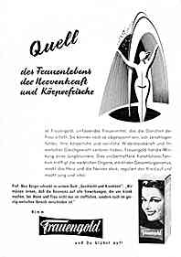 "Jede Mutter trägt die Verantwortung!" "Die Pubertätsperiode - Entwicklungs- und Reifezeit - des jungen Mädchens ist die wichtigste Zeit im Leben jeder Frau. Sollen Störungen des Allgemeinbefindens in dieser Zeit wie Schlafstörung, Krampfzustände, Gemütsverstimmungen, Ohnmachtsgefühl, gesteigerte Erregbarkeit, die häufig die Grundlage zu den sogenannten Mädchenkrankheiten - Blutarmut und Nervenschwäche - bilden und zu den später auftretenden Frauenkrankheiten führen, vermieden werden, dann ist für eine gute Entwicklung des reifenden Mädchens zu sorgen. Hier ist Frauengold, das weibliche Konstitutions-Tonikum, wirklich der große Helfer der Frau. Es sorgt sowohl für eine gesunde kräftige Entwicklung der weiblichen Organe als auch für eine normale Drüsentätigkeit. Nimm Frauengold und Du blühst auf!" - Zeitschriftenwerbung (Anm.: Frauengold enthielt mind. 16,5% Alkohol)