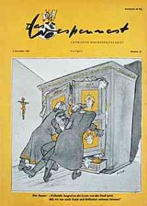 | |  | | | | Das Wespennest - "Satirische Wochenzeitschrift" - Titel: "Der Bauer: "Vielleicht begreifen die Leute von der Stadt jetzt, daß wir nur noch Gold und Brillanten nehmen können!"" | | "Der Simpl - "Kunst - Karikatur - Kritik" - Titel: "Die weisse Linke - Die schwarze Rechte" - Weitere Themen z.B.: "Entnazifizierung", "Flüchtlinge", "Dunkle Existenzen" | | |