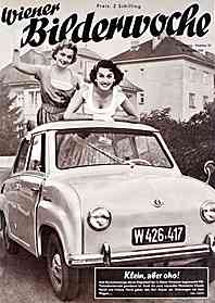 | | Wiener Bilderwoche - Titel: "Klein, aber oho! sind die Autozwerge, deren Siegeslauf der in dieser Nummer beginnende WB-Tatsachenbericht gewidmet ist." |