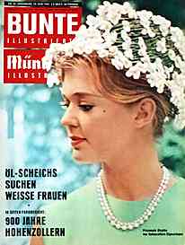 | | NEUE ILLUSTRIERTE - Titel: "Frauen die Geschichten machen: Die doppelte Kim Novak" - Thema z.B.: "Die Herzensaffären europäischer Prinzessinnen" | | BUNTE ILLUSTRIERTE - "Zum Titelbild: Prinzessin Birgitta von Hohenzollern-Sigmaringen, geborene Prinzessin von Schweden, entzückte durch ihren Charme alle Gäste der 900-Jahr-Feier auf der Zollernburg" - Weiteres Thema z.B.: "Ölscheichs suchen weiße Frauen - Da sprach der Scheich zum Emir: Die nehm' wir!" | | NEUE ILLUSTRIERTE - Titel: "Daliah Lavi - Charmanter Film-Import aus Israel" - Themen z.B.: "Tina Onassis erzählt: Mein Leben, meine Liebe, mein Geld...", "Graf Berghe von Trips - Denn einmal erwischt es uns alle", "Typ 08/15 - Ein kritischer Bericht über die Jugend von heute"
