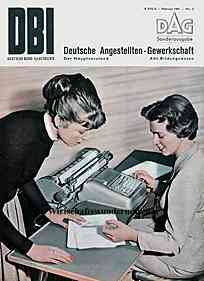 | | | | DBI – Deutsche Büro-Illustrierte – Titel: "Moderne Diktierabnahme. Das auf die Folie gesprochene Diktat wird vom Olympia-Diktiergerät abgenommen u. in die vollelektrische Olympia SGE 20 übertragen." | | DBI – Deutsche Büro-Illustrierte – Titel: Das "KIENZLE-Fertigungs-Programm reicht heute von der einfachen Organisationsmaschine bis hin zum hochleistungsfähigen Buchungsautomaten mit elektronischer Multiplikation." | | |