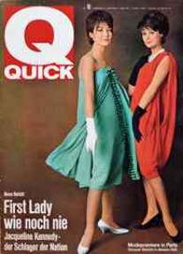 | |  | | QUICK - Titel: "Das Glück im Weissen Haus - Amerikas schöne First Lady und ihr Sohn John F. Kennedy junior" - Thema z.B.: "Sind die Preise noch zu stoppen? Der Frühling wird teuer werden" | | QUICK - Titelthema: "Amerikas neues Leitbild: Die Kennedys" - "Der große Bericht: Jackie der Schlager der Nation - Der Lebensroman der Jacqueline Kennedy"