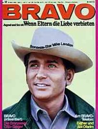 | |  | | | | BRAVO - Titelbild: "Bonanza-Star Mike Landon" - Themen z.B.: "Jugend und Sex 68: Wenn Eltern die Liebe verbieten", Brigitte Bardot und Sean Connery: "BB-Sex und 007", "Ich kann nicht tanzen, ich kann nicht singen. Aber meine Mutter verlangt: Ich soll ein Star werden!", "Sie gefällt den Jungen am besten: Die kleine Mollige" | | BRAVO - Titel: "So filmen die Cartwrights - Dan Blocker begrüßte BRAVO als Gast bei den Dreharbeiten zu einer neuen "Bonanza"-Folge" - Thema z.B.: ""Die Jungfrauenfalle" - Ein Disk-jockey erzählt - nicht nur über Musik"